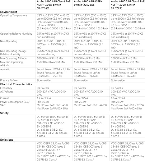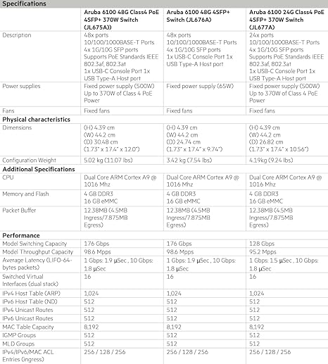 Aruba 6100 Switch Series The Aruba CX 6100 Switch Series is modern family of entry level access switches ideal for enterprise branch offices and SMB networks. Optimized for reliable, simple and secure access, the CX 6100 switches provide a convenient wired access solution for enterprise networks supporting IoT, mobile and cloud applications. The CX 6100 series is based on the Aruba ASIC architecture with the programmable AOS-CX operating system used across the entire Aruba CX portfolio for a more consistent, more efficient operator experience. This layer 2 switch series has convenient builtin high speed uplinks with up to 370W of PoE to support IoT devices such as security cameras and wireless APs, and includes a compact and fanless model ideal for use in quiet work spaces. With robust QoS, support for static routing, and IPv6, the CX 6100 also simplifies ownership with no software licensing requirements.. Features Enterprise-class Layer 2 connectivity with support for ACLs, robust QoS and static routing Convenient built-in 1/10GbE uplinks and up to 370W of Class 4 PoE for support of IoT devices Compact and fanless 12 port model for quiet deployment Automated configuration and verification with Aruba NetEdit Software defined ready with REST APIs Simplify adds, moves and changes with colorless ports