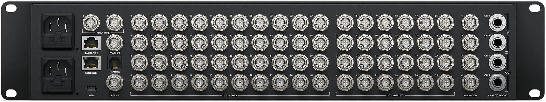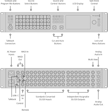 ATEM Constellation HD switcher feature a compact rack mount design with a built-in control panel. This allows operation of the switcher, critical during setup or for emergency use. Also included is a large LCD so you can see program output and change switcher settings via on screen menus. The compact design is perfect for portable live production, with the rear of the switcher including the connections for 3G-SDI inputs, 3G-SDI aux outputs, balanced audio and Ethernet for control.