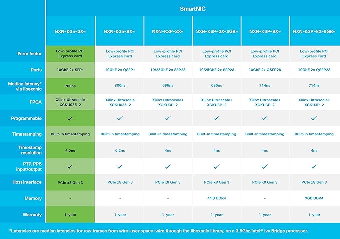 Cisco Nexus™ NXN-K35-2X, Ultra-Low Latency 780 ns, K35-S FPGA SmartNIC, PCIe, 10GbE, 2xSFP+, Built-in timestamping with 6.2ns Resolution, PTP (Precision Time Protocol), 1-Year Warranty (NXN-K35-2X)