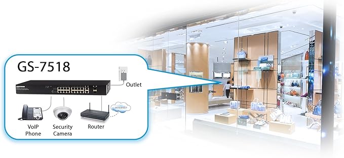 Comtrend’s 18-Port Unmanaged PoE+ Gigabit Ethernet Switch the GS-7518 delivers data and power to network devices in a flexible and optimized solution The GS-7518 has 16 PoE ports and 2 Gigabit Ethernet Combo ports The GS-7518 has a durable metal case with energy- efficient ports Boasting a 280 W total power budget this switch can supply even your most power- intensive devices The GS-7518 offers cost savings and ease of installation making it the ideal solution for small scale PoE projects such as deploying security cameras VoIP phones and access points Expand to a Gigabit Network The GS-7500 series allows for an easy way to transition your network to a Gigabit PoE network Gigabit ports are 10x faster than standard ports Energy Efficient The GS-7500 series supports IEEE802 3az for Ethernet function Connect Multiple High-Powered Devices Supplies up to 30 watts of power per port The 280 W total power budget ensures you always have enough power Connect & Go With no configuration needed this series of unmanaged switches are plug and play