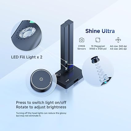 CZUR Shine Ultra a revolutionary book scanner that covers all your scanning needs! Both work as a document camera for online teaching&meeting.Featuring our patented "curve-flatten technology", auto-focus, auto page-turning detecting,it scan books even faster, with an incredible of 1 second per page, so scanning an entire book will only take you minutes. Along with a lot more features, this is your perfect scanning companion.