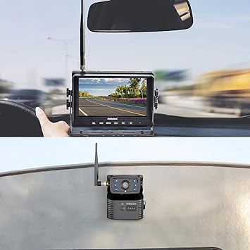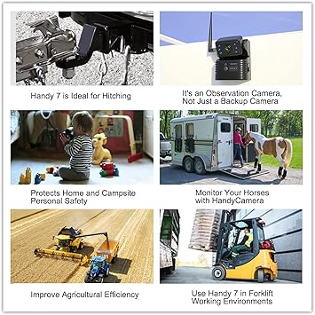 Recommended for the installation distance under 33ft from the monitor to the rearview camera, compatible with HandyCamera, CA108, CA109, CA110, CA112, CA115, CA116, CA613T, CA614T, CA615T, CA616T add-on cameras. Provides interference-free reception for vehicles up to 33 feet guaranteed at high speed Up to 984 feet wireless line of sight wireless reception range in open spaces The HandyCamera comes with magnetic base for instant mounting and removing Metal Plate with 3M Tape is included in the package, you can easily stick it onto the aluminum or fiberglass surface and mount the HandyCamera This hitch camera is powered by a rechargeable battery, ultra-low power consumption for standby (only 30 uA) Water resistant IP67 rating level protects against rain and snow 720P image quality, 120-degree wide-angle lens, 6 IR LEDs for superior night vision 7 inch IPS depolarized screen supports Micro-SD cards up to 128GB Multiple split view mode available on the monitor and displays up to 4 cameras views Adjustable rear assist marker lines help you backing up properly A microphone built-in the camera picks up sounds which make reversing/hitching safer
