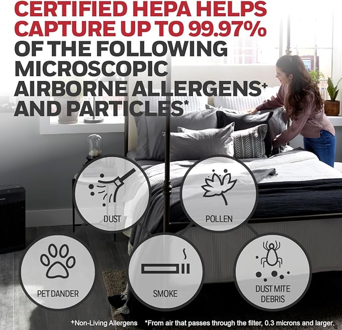 Honeywell HPA5300 InSight Series HEPA Air Purifier console helps provide cleaner, fresher air in extra-large rooms of 500 square feet. It includes HEPA Filtration, which helps capture up to 99.97% of the following allergens and particles: dust, pollen, pet dander, dust mite debris and smoke*. This Honeywell air purifier can filter & circulate air up to 4.8 times an hour.** If you have pets or stale indoor air, air purifiers help deliver cleaner, fresher air. The Intelligent Air Quality Sensor continuously displays and monitors air quality. Plus, this air purifier includes InSight Display at-a-Glace which illuminates to show the 4 cleaning levels, air quality indicator and Auto Mode setting. This quiet air purifier has an auto-off timer option at 2,4, or 8 hours, and a dimmer option for control panel lights. This Honeywell HEPA Air Purifier is part of our InSight Series. This product earned the ENERGY STAR label by meeting strict energy efficient guidelines set by the U.S. EPA. Always purchase Genuine Honeywell replacement air purifier filters. They are certified to help capture odors and the following microscopic airborne allergens and particles*: dust, pollen, pet dander, dust mite debris and smoke. Other compatible filter replacements are not guaranteed to offer the same performance or efficiency. Recommended filter replacement: True HEPA R Filters 1x/yr. Odor Reducing Pre-Filter A 4x/yr. Disclaimers: * From the air that passes through the filter, 0.3 microns and larger. ** Based on 3rd party independent CADR testing for the smoke CADR value when operated at the highest level. Air circulation depends on many factors, such as room size and configuration. There is no guarantee that all of the air in a room will pass through the filter. The ENERGY STAR name and mark are registered trademarks owned by the U.S. EPA.