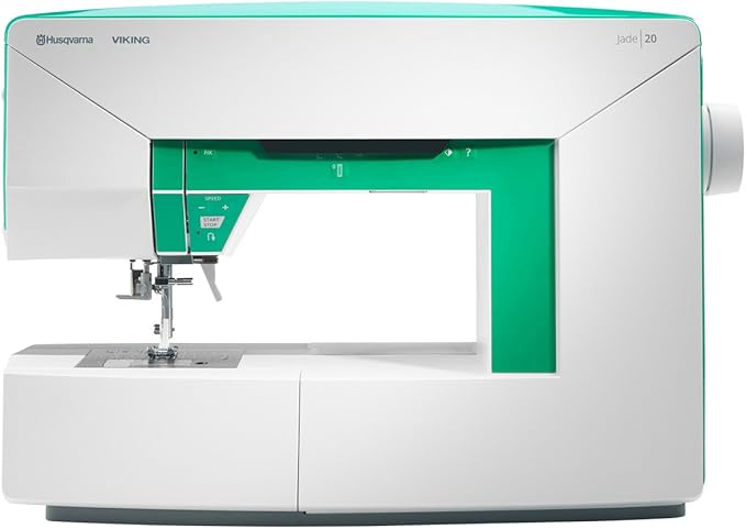 The Husqvarna Viking Jade 20 Sewing Machine is a fantastic sewing machine with great features and modern design all in one. The machine of your dreams when you want your personality to shine through! Sew large home dec projects, quilts or garments easily thanks to the large area to the right of the needle, 200mm (almost 8"). The sewing space is the largest compared to most other sewing machines at this price point. A Sewing Guide is conveniently located in the lid. Just find the fabric type and the sewing technique and it will tell me the perfect stitch and settings to use to achieve the best results. The sleek modern design looks stylish and hides all the included accessories, even the foot pedal. No need to hide your sewing machine in a cupboard. It will look stylish anywhere. Sew without the foot control for easy, consistent speed. This function is great for sewing decorative stitches, long seams and winding a bobbin. It is also ideal for sewers with physical limitations. 200mm sewing space Start/stop function Sewing Guide 82 beautiful 7mm wide stitches Large assortment of optional accessories Needle stop up/down Presserfoot recommendation-button One-step buttonholes Drop feed teeth Free motion with any stitch Mirror image side-to-side 29 Needle positions Adjustable presser foot pressure Uniquely designed accessory compartment 7 HUSQVARNA VIKING original snap-on presser feet included. Speed control Built-in needle threader View presser foot recommendation LED display Bobbin winds from the needle LED Lights