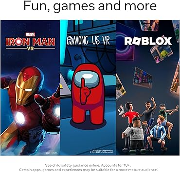 Meta Quest 2 is the all-in-one system that truly sets you free to explore in VR. With no wires or cables, simply put on the headset, draw out your play space, and jump into fully immersive, imagination-defying worlds. A fast processor and immersive graphics keep your experience smooth and seamless, even as high-speed action unfolds around you. 3D positional audio, hand tracking and easy-to-use controllers make virtual worlds feel real. A built-in battery lets you explore further for longer as you discover a growing library of over 500 titles across gaming, social/multiplayer, fitness and entertainment. Incredible social spaces and multiplayer arenas let you meet, play and build communities with people from all over the world. Travel universes in blockbuster fantasies, scare yourself witless in horror adventures or collaborate with colleagues in innovative workspaces. Sit front row with friends and family at movies and live events, find your new workout crew or join quests with fellow adventurers. And you can connect your VR headset to a gaming-compatible computer (PC and cable sold separately). Let your friends and family into your VR world by casting your experience to compatible TVs and other screens. And anywhere you go in the real world, you can take your lightweight, portable Quest 2 with you. *Requires mobile device, wifi and companion app for setup. Account registration required. See child safety guidance online; Accounts for 10+. Certain apps, games and experiences may be suitable for a more mature audience.
