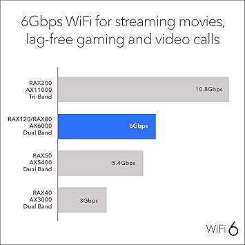 Nighthawk AX6000 12-stream Wi-Fi router is powered by the industry's latest Wi-Fi 6 (802.11ax) standard with 4 times increased data capacity to handle today's and tomorrow's growing home network. Blazing-fast combined Wi-Fi speeds up to 6Gbps and ax optimized 64 bit 2.2GHz quad-core processor powers Smart home applications, ultra-smooth 4K UHD streaming, online gaming, and more. Ax Wi-Fi features orthogonal frequency-division multiple access (of DMA) that dramatically increases network capacity. Plus, eight high-performance antennas on the router amplify Wi-Fi signals for maximized range and Reliable coverage. Nighthawk AX6000 12-stream router is also the first home router to have a 5G Multi-Gig port.
