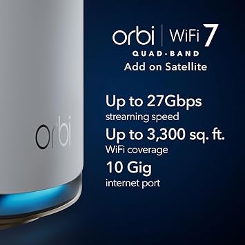 NETGEAR Orbi 970 Series (RBE970) Quad-Band WiFi 7 Mesh Add-on Satellite - Works with Existing 970 Series Mesh System or Router, Security Features, Covers up to 3,300 sq. ft., BE27000 802.11be