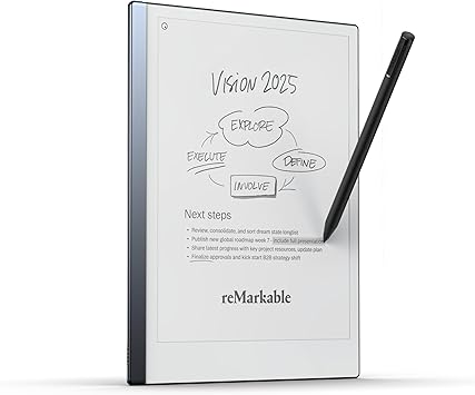 Introducing the reMarkable tablet, the paper tablet that replicates the tactile feel and versatility of writing on paper without adding any digital distractions. At just 4.7 mm thin reMarkable provides a genuinely paper-like feel in the digital world. Jot down notes, read, and sketch out ideas on an electronic notebook that keeps all your work perfectly organized and right at your fingertips. Sort your work with folders and tags, write directly on PDFs, and instantly convert handwritten notes to typed text. Effortlessly share your work via email, or integrate with cloud storage services like Google Drive, Dropbox, and OneDrive to streamline your workflow. The reMarkable bundle comes with Marker Plus, a precise digital writing tool with a built-in eraser that feels just like writing on paper. It also includes a 100-day free Connect trial, which gives you unlimited cloud storage and sync, and unlocks note-taking in the mobile and desktop apps. Experience note-taking in its purest form with the reMarkable notebook tablet, setting a new standard for productivity and focus.