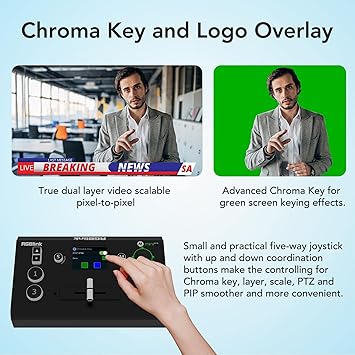 Streamlined Live Broadcasting - The RGBlink mini-pro is a versatile video switcher and mixer capable of streaming a 6-picture Preview or Program from any of its 4 high-quality 4K HDMI inputs. Seamlessly integrate with third-party live streaming software like OBS to elevate your live broadcasts to a professional level. Intuitive User Interface - Designed for ease-of-use, the mini-pro features a 2-inch full-color touchscreen and a 5-direction joystick. These intuitive controls simplify tasks such as layer manipulation, aspect ratio adjustments, PTZ control, and chroma keying. Advanced Chroma Key Capabilities - The mini-pro comes with built-in Chroma Key functionality, allowing for background removal and overlay for a more dynamic virtual studio experience. Enhance your transitions with 14 onboard effects, seamlessly controlled via the T-Bar. Comprehensive PTZ Control - Compatible with VISCA protocol, the mini-pro offers full control over your PTZ cameras. Adjust lens movement, focus, and zoom effortlessly. Save up to 4 PTZ presets, capturing your camera's position and zoom settings for quick recall in future sessions. Versatile Functionality - Beyond seamless video switching, the mini-pro excels in audio embedding and de-embedding, and automatically identifies various color depths including RGB4:4:4, YUV4:4:4, YUV4:2:2, and YUV4:2:0. Remote Control via App - The complimentary XPOSE mini software enables convenient control of the mini-pro from various devices including PCs, Macs, iPads, iPhones, and Android devices. All you need is a shared network with integrated WLAN. The software replicates all functions on a virtual mini-pro interface for intuitive operation.