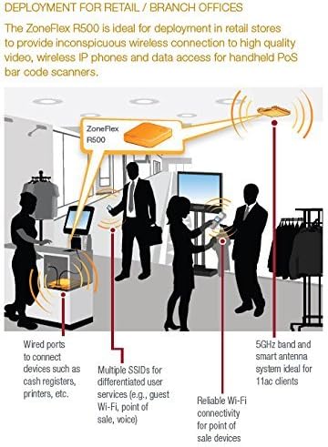 It features a 5 GHz 802.11a/n/ac radio in a 2x2:2 spatial stream configuration, capable of physical layer rates of up to 867 Mbps. A 2.4GHz 802.11b/g/n radio in a 2x2:2 spatial stream configuration offers an additional 300 Mbps of physical layer throughput. The Ruckus ZoneFlex R500 is an ideal access point for medium client density enterprise and hotspot environments including SMBs, schools, hotels, branch offices and retail outlets. Does not include power adapter or PoE injector.