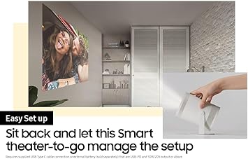 Take the big screen experience to go with The Freestyle. This smart theater-to-go moves to where the action is. Just point and play on the wall, ceiling or even your table. The Freestyle automatically sets up your best picture experience, adjusting focus, keystone and leveling—at the image size you want. You’ll be set to stream your shows using the Smart TV capabilities, check your social feed, play games, and hear it all in rich 360 sound. Gather your friends, your content is going places. Watch in Full High Definition with The Freestyle, 2x sharper than other personal projectors with HD. With approximately 8.3 million pixels and 1080X1920 resolution, you can sit up closer than with HD, making everything larger, crisper and clearer.***** SmartThings delivers a color experience customized for your space with The Freestyle. Whether you’re projecting on a brick wall or wooden table, the app automatically calibrates the color temperature and brightness of your image for the surface you watch on.***** *Includes Samsung SmartHub; external content from the Micro HDMI port and compatible devices with AirPlay 2, SmartThings or Tap View. Voice Assistants and Apps are subject to change. Some functions require internet connection via Wi-Fi or from a mobile device. **Requires supplied USB Type C cable connection or external battery (sold separately) that are USB-PD and 50W/20V output or above. ***Optimal screen sizes from 30" - 100" measured diagonally; based on The Freestyle’s distance from the surface. ****Voice Assistants and Apps are subject to change. Some functions require internet connection via Wifi or from a mobile device. *****Brightness varies based on surrounding light.