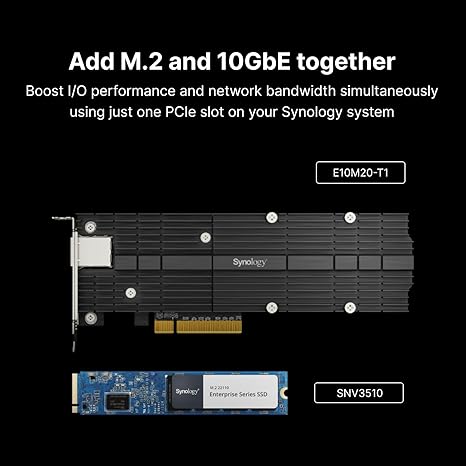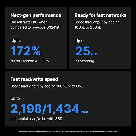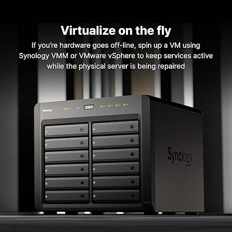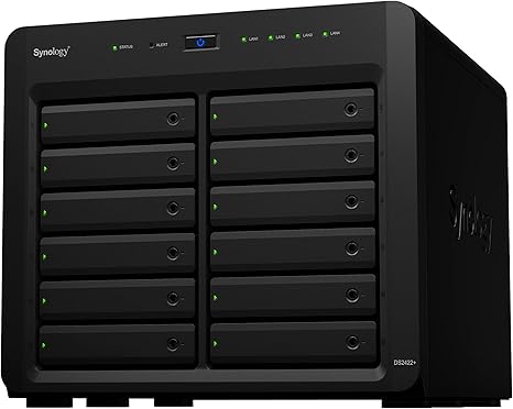 Synology DiskStation DS2422+ is a compact 12-bay desktop NAS that takes file sharing and management to the next level. The unit can be scaled to 24 drive bays and excels at serving large data sets in multiuser environments. It comes with powerful file management, surveillance, and backup capabilities, and can serve as high-quality video and VM storage. With support for up to 32 GB of memory, NVMe SSD cache, and 25GbE network cards, the DS2422+ is ready for large-scale business applications.