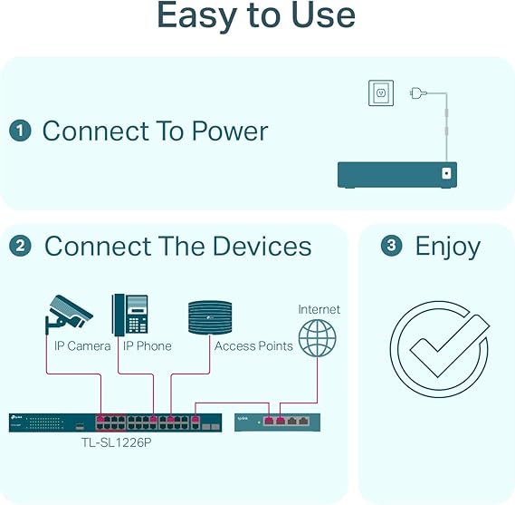 TL-SL1226P complies with the 802.3af/at PoE+ standard supports up to 30 W on each PoE port. The total 250 W PoE power budget for the 24× PoE ports makes it has wide range of applications, such as surveillance, offices, dormitories, and small businesses. It is fully compatible with IP cameras, access points, IP phones, computers, printers, and etc.