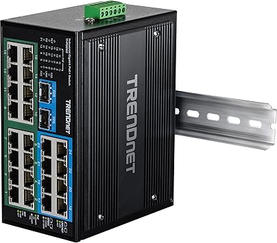 TRENDnet 26-Port Hardened Industrial Unmanaged Gigabit DIN-Rail Switch, TI-PG262, 16 x Gigabit PoE+ Ports, 8 x Gigabit RJ-45 Ports, 2 x SFP Ports, IP30, Lifetime Protection, Black