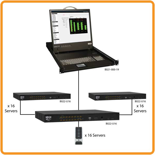 Controls an entire network in just 1U of rack space. The B022-U16 can directly control 16 servers/computers from a single console. Compatible with PS/2 and USB servers/computers. Simple port switching via on-screen display (OSD) or keyboard hot keys. Multiple B022-U16 units can be daisy-chained from compatible Tripp Lite rackmount console KVM switches to control up to 512 servers/computers. Includes two USB+PS2 combo KVM cable kits and rackmounting hardware. 1-year warranty.