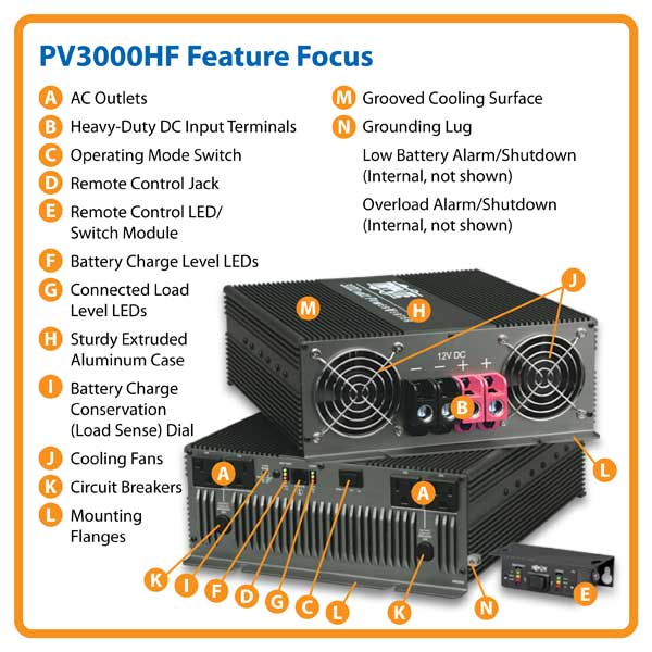 Are you tired of filling heavy gas cans? Are you looking for a clean, reliable alternative to a portable generator? The PV3000HF PowerVerter® Ultra-Compact Inverter is the solution you seek! The PV3000HF powers the equipment you commonly use at home or work—power tools, portable lighting, notebook computers and more—wherever life takes you. It's the ideal power solution for RVs, commercial and fleet vehicles, emergency vehicles, remote sites and any other application that requires a clean, quiet AC power source. The PV3000HF efficiently converts DC (battery) power into 120V AC (household) power to run any type of equipment, from power tools to computers. And unlike portable generators, the PV3000HF requires no fuel and produces no noise or fumes. With its 3000-watt capacity and 4 AC outlets, this inverter can power multiple items of equipment with ease. The PV3000HF can also deliver up to 6000 watts instantaneously to support power-hungry equipment start-ups. The PV3000HF comes with a free Remote Control Module (Tripp Lite model APSRM4) and 25-ft. cable, enabling you to control the inverter from anywhere inside your vehicle.