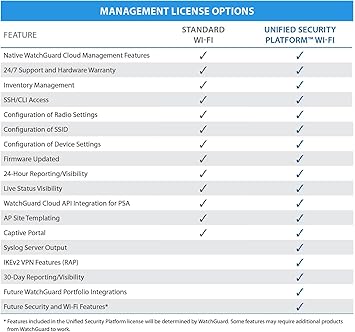 WatchGuard's AP 130 is an ideal Wi-Fi 6 solution to support low-density indoor environments like a small office or remote workers with a secure WPA3 encryption. Integrated security is delivered by supporting the 802.11 standard and WPA3 encryption to enhance the Wi-Fi experience. Includes Wi-Fi 6 2x2 radio with four internal antennas. Maximum TX power delivers 22 dBm and a 3dBi antenna gain with one Ethernet port supporting up to 1 Gbps. Maximum data rate includes a crystal clear and seamless wireless experience supporting 1.2 Gbps on the 5 GHz band and 574 Mbps available on the 2.4 GHz band. WatchGuard's AP130, AP330, AP430CR, and AP432 requires an active Management License. Select from a Standard or USP Management License to activate and access WatchGuard Cloud. The Management License is required to activate and manage the WatchGuard access points.